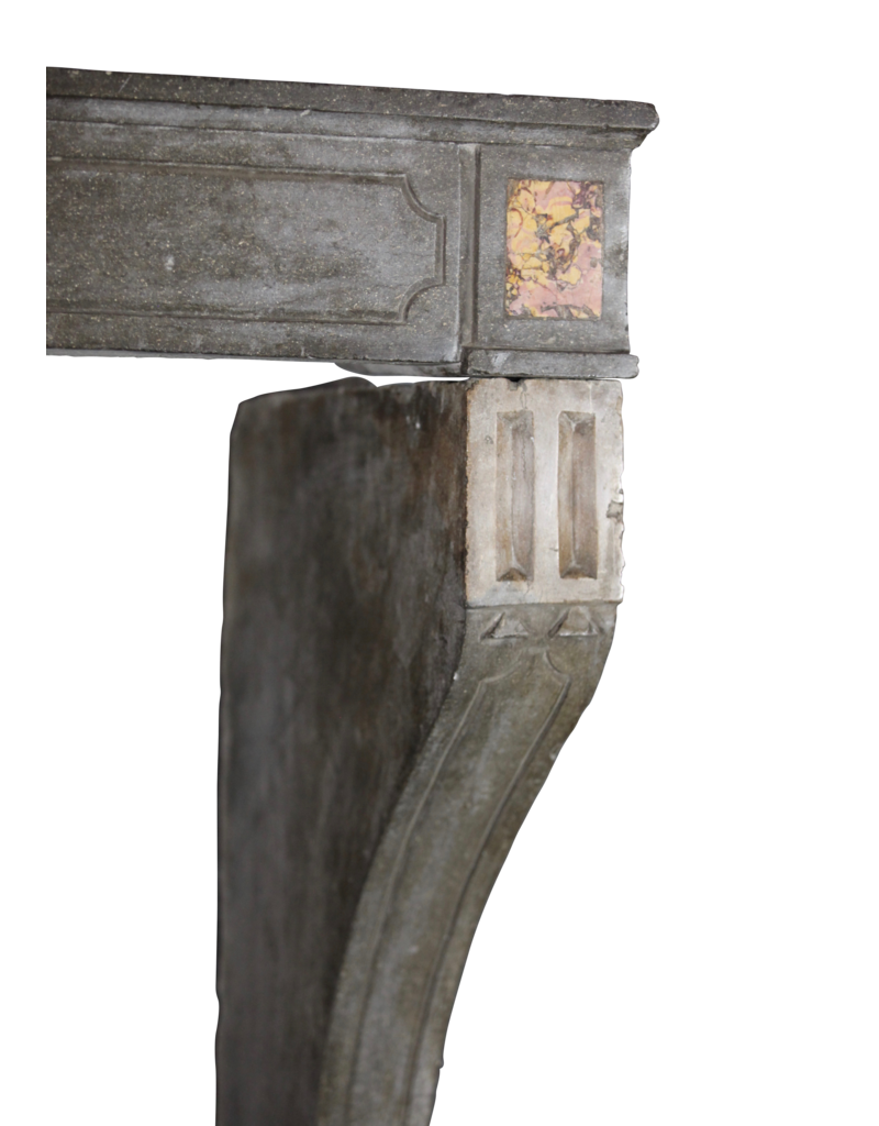 This is a very special fireplace surround from the Beaujolais region. The Buxy stone has a Marble Fireplace Surrounds Brocatelle de Spain inlay. This chimeney piece origines of the French Directoire period, 18th century. Elegant and color full mantle piece.